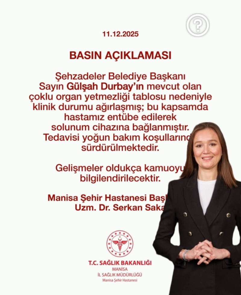 “Şehzadeler Belediye Başkanı Sayın Gülşah Durbay’ın mevcut olan çoklu organ yetmezliği tablosu nedeniyle klinik durumu ağırlaşmış; bu kapsamda hastamız entübe edilerek solunum cihazına bağlanmıştır. Tedavisi yoğun bakım koşullarında sürdürülmektedir. Gelişmeler oldukça kamuoyu bilgilendirilecektir.”