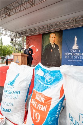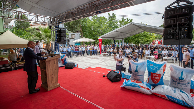 İzmir Büyükşehir Belediyesi’nintarım politikasının dört başlığının bulunduğunu, bunlardan ilkinin yerli tohumu gün ışığına çıkarmak olduğu kaydeden Soyer, “en büyük hazinemiz” dediği atalık tohumları çoğaltacaklarını söyledi. Soyer, “Yerli tohumları yok ediyorlar, buna izin vermeyeceğiz. O tohumları yaşatacağız. Dört başlıktan bir diğeri de mutlaka tarım ürünlerini işleyeceğiz. Tarım ürünü sadece tarım ürünü olarak kaldığı sürece değerini bulmuyor. Katma değerini büyütecek şekilde işlememiz lazım. Üçüncüsü, üretici tek başına hiçbir şeydir. Kooperatif çatısı altında mutlaka bir araya gelmek ve el ele vermek lazım. Siz bir araya gelirseniz, ancak o zaman köyünüzü pazarlayacak bir güç olabiliyorsunuz. Siz kooperatif çatısı altında örgütlenin ne üretiyorsanız almaya söz veriyorum. Yeter ki, kooperatif çatısı altında örgütlenin. Dördüncüsü de; siz ürettikçe biz satın almaya devam edeceğiz. Ama yerli tohuma sahip çıkacaksınız. Ürününüzü işleyeceksiniz. Ayrıca ilçede 12 üreticiye 40 manda dağıtılacak. Mandanın sütünden yapılan peynir dünyanın parası. Biz bu peyniri ithal ediyoruz. Oysa manda buradaydı. Burada ürüyordu, çoğalıyordu ve üreticisi ekmek yiyordu. Biz bu hatalardan döneceğiz ve bu toprağın bereketini yeniden gün ışığına çıkaracağız. Siz yeter ki alın teri dökmeye devam edin. O alın terinin bir zerresini karşılıksız bırakmayacağız” dedi. Konuşmaların ardından yem çuvalları köylülere dağıtıldı.