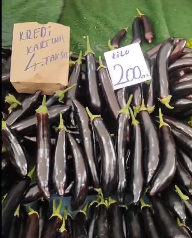 Bir semt pazarında patlıcanın kilosunun 200 TL olması ve tezgâha “Kredi kartına 4 taksit yapılır” yazısının asılması vatandaşın yaşadığı ekonomik sıkıntıyı gözler önüne serdi.