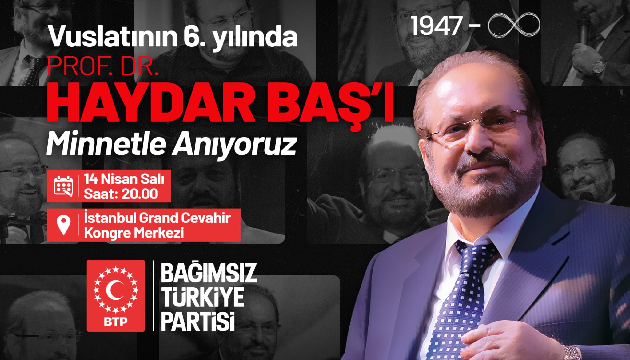 HABERMAX. Bağımsız Türkiye Partisi (BTP), merhum Genel Başkanı Haydar Baş’ı vefatının 6. yıl dönümünde kapsamlı etkinliklerle anıyor. Parti tarafından 10-17 Nisan tarihleri “Prof. Dr. Haydar Baş’ı Anma Haftası” ilan edilirken, Türkiye genelinde ve yurt dışında çok sayıda program gerçekleştiriliyor.