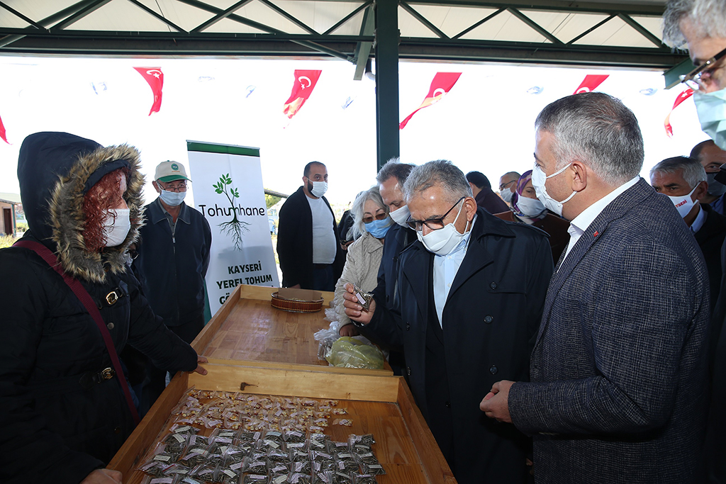 Doğal Ürünler Bahçesi’nde gerçekleştirilen ‘Yerel Tohum Takas Şenliği’ etkinliğine Büyükşehir Belediye Başkanı Dr. Memduh Büyükkılıç, İl Başkanı Şaban Çopuroğlu, Talas Belediye Başkanı Mustafa Yalçın, Tarım İl Müdürü Mustafa Şahin, Kayseri Tohum Gönüllüleri ve birçok üretici katıldı.
