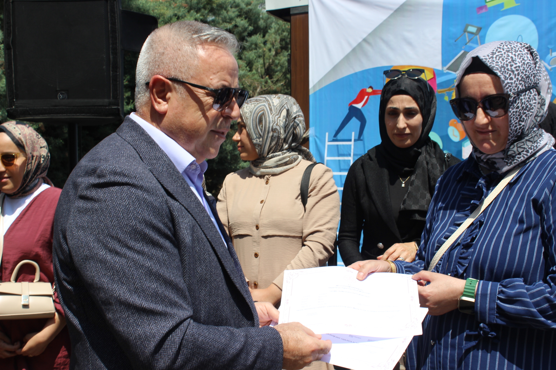İlçe Halk Eğitim Müdürü Şükrü Dikici konuşmasında, 2024-2025 döneminde Halk Eğitim Merkezi olarak gerçekleştirdikleri eğitim faaliyetleri hakkında bilgi verdi. Dikici, yüzlerce kurs açtıklarını ve binlerce kursiyere ulaştıklarını ifade ederek, “El sanatları, meslek edindirme ve kişisel gelişim kurslarımızla vatandaşlarımıza katkı sağlamaya devam ediyoruz,” dedi.