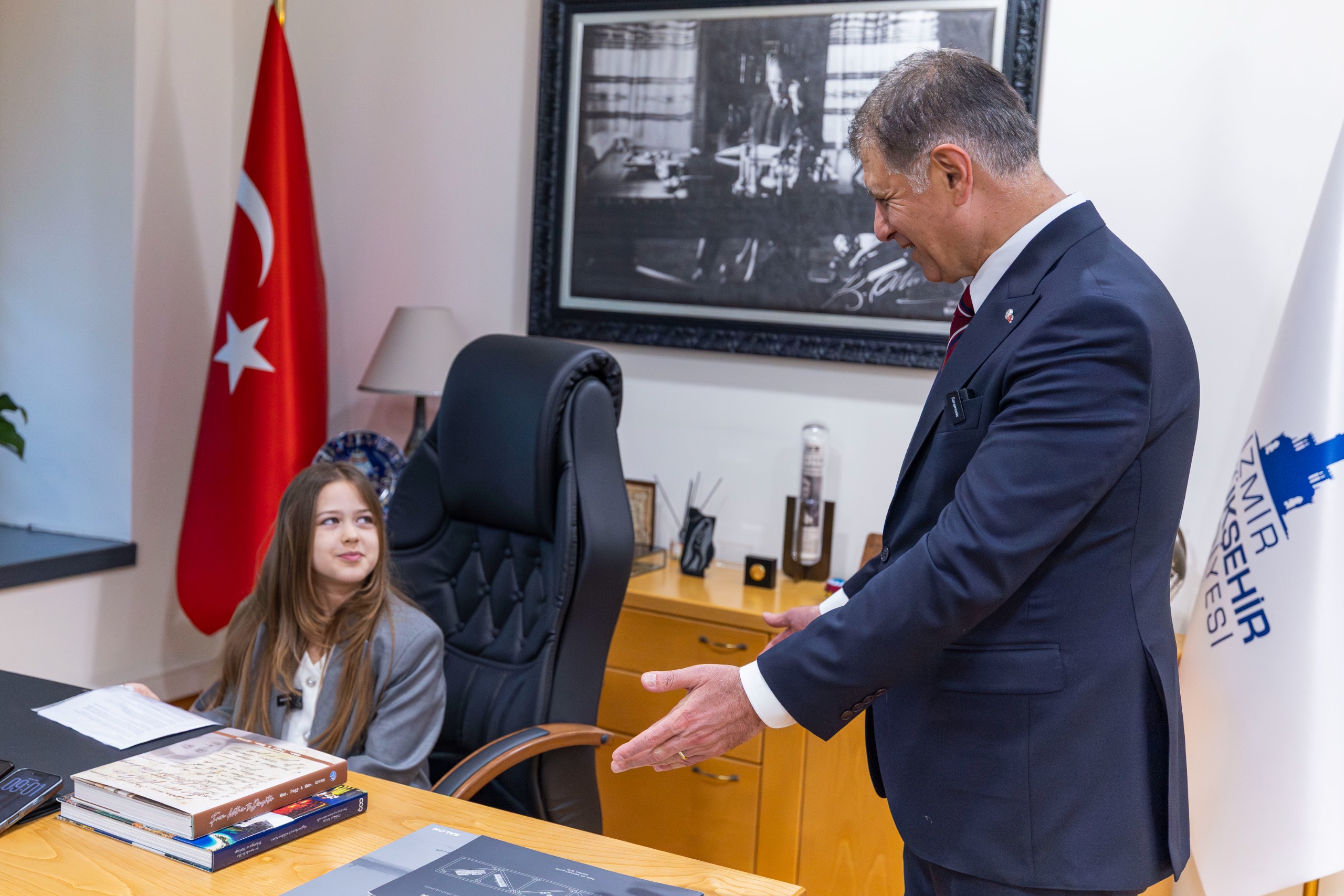 HABERMAX. İzmir Büyükşehir Belediye Başkanı Dr. Cemil Tugay, 23 Nisan Ulusal Egemenlik ve Çocuk Bayramı’nda koltuğunu 5. sınıf öğrencisi ve İzmir Çocuk Meclisi üyesi Meryem Günay ile 4. sınıf öğrencisi Aras İpek’e devretti. Minik başkanlar, eğitimden güvenliğe uzanan talepleriyle barış, sevgi ve umut dolu bir gelecek çağrısı yaptı.