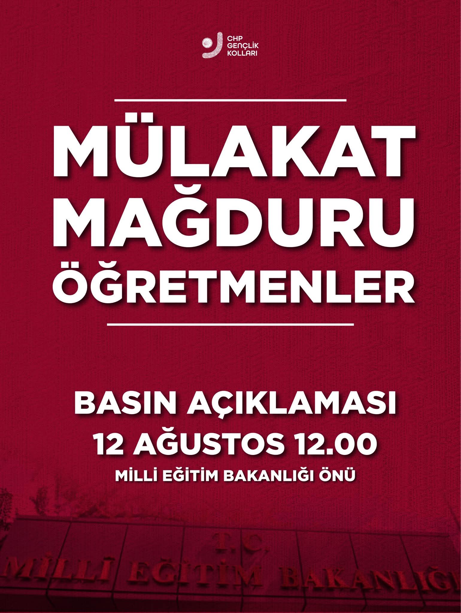 HABERMAX. Cumartesi Halk Partisi (CHP) Gençlik Kolları Genel Başkanı Cem Aydın, mağdur öğretmen adaylarına destek vermek ve adalet talebini duyurmak için önemli bir çağrıda bulundu. Sahte diplomalar dağıtanlar ve mülakatlarda haksızlık yapanlara karşı mücadele vurgusuyla, Mülakat Mağduru Öğretmenler’in basın açıklamasında bir araya gelinmesi planlanıyor.