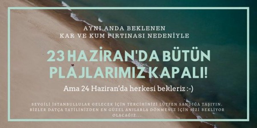 CHP’li İzmir’in Çeşme Belediyesi, Muğla’nın Datça Belediyesi ve Antalya’nın Kepez Belediyesi, “İstanbul’dan gelen Fırtına nedeniyle 23 Haziran’da Çeşme’de denize girmek, hatta ilçemize gelmek tehlikeli ve yasaktır” şeklinde paylaşımlar yaptılar.