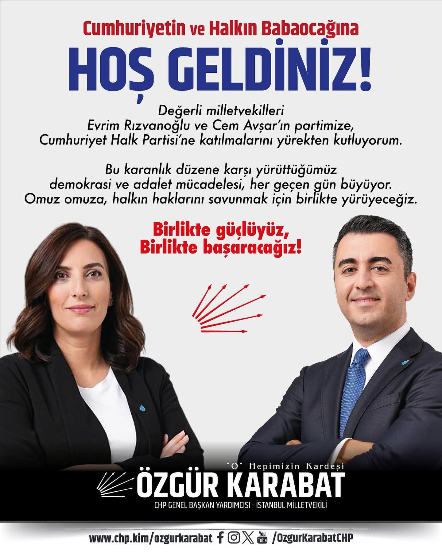 Cumhuriyet Halk Partisi Genel Başkan Yardımcısı ve İstanbul Milletvekili Özgür Karabat, DEVA Partisi’nden ayrılarak CHP’ye katılan milletvekilleri Evrim Rızvanoğlu ve Cem Avşar için sosyal medya hesabından bir mesaj yayımladı.