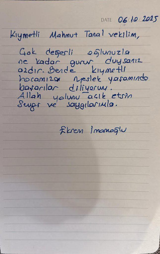 Tanal’ın sosyal medya hesabından paylaştığı mesajda şu ifadeler yer alıyor: “Cumhurbaşkanı Adayımız, İstanbul Büyükşehir Belediye Başkanımız Sayın Ekrem İmamoğlu’na, Evladım Operatör Dr. Mert Tanal’ın, Amerikan Cerrahlar Birliği tarafından verilen FACS unvanına layık görülmesi vesilesiyle göndermiş olduğu samimi mektubu için en içten teşekkür ederim. Ülkemizin köklü eğitim kurumlarında yetişmiş, emeğiyle, vicdanıyla ve bilgisiyle insanlığa hizmet eden bir Türk hekimi olarak, evladımın bu başarısı Atatürk’ün ‘Beni Türk hekimlerine emanet ediniz’ vecizesinin anlamını bir kez daha yaşatmıştır. Liyakate, bilime ve emeğe değer veren Sayın İmamoğlu’nun bu ince düşüncesi bizleri onurlandırmıştır. Kendisine ülkemiz ve milletimiz adına yürüttüğü onurlu mücadelede başarılar diliyorum.”