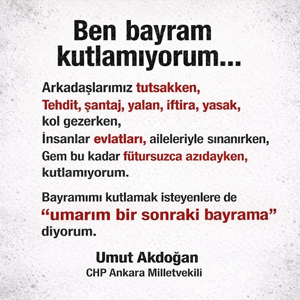 HABERMAX. CHP Ankara Milletvekili Umut Akdoğan, yayımladığı mesajla bu bayram kutlama yapmayacağını duyurdu. Akdoğan, gerekçe olarak ülkedeki siyasi tutuklamaları, baskıları ve toplumsal adaletsizliği gösterdi.