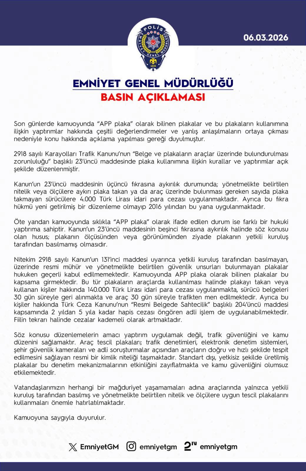 HABERMAX. ANKARA – Emniyet Genel Müdürlüğü (EGM), son günlerde kamuoyunda “APP plaka” olarak bilinen standart dışı plaka kullanımına yönelik cezai yaptırımlar hakkında kritik bir basın açıklaması yayımladı. 06.03.2026 tarihli açıklamada, sahte veya yönetmeliğe aykırı plaka kullanan sürücülerin ağır mali ve adli yaptırımlarla karşı karşıya kalacağı vurgulandı.