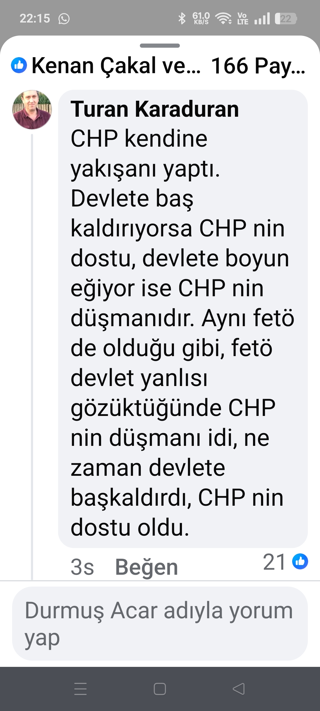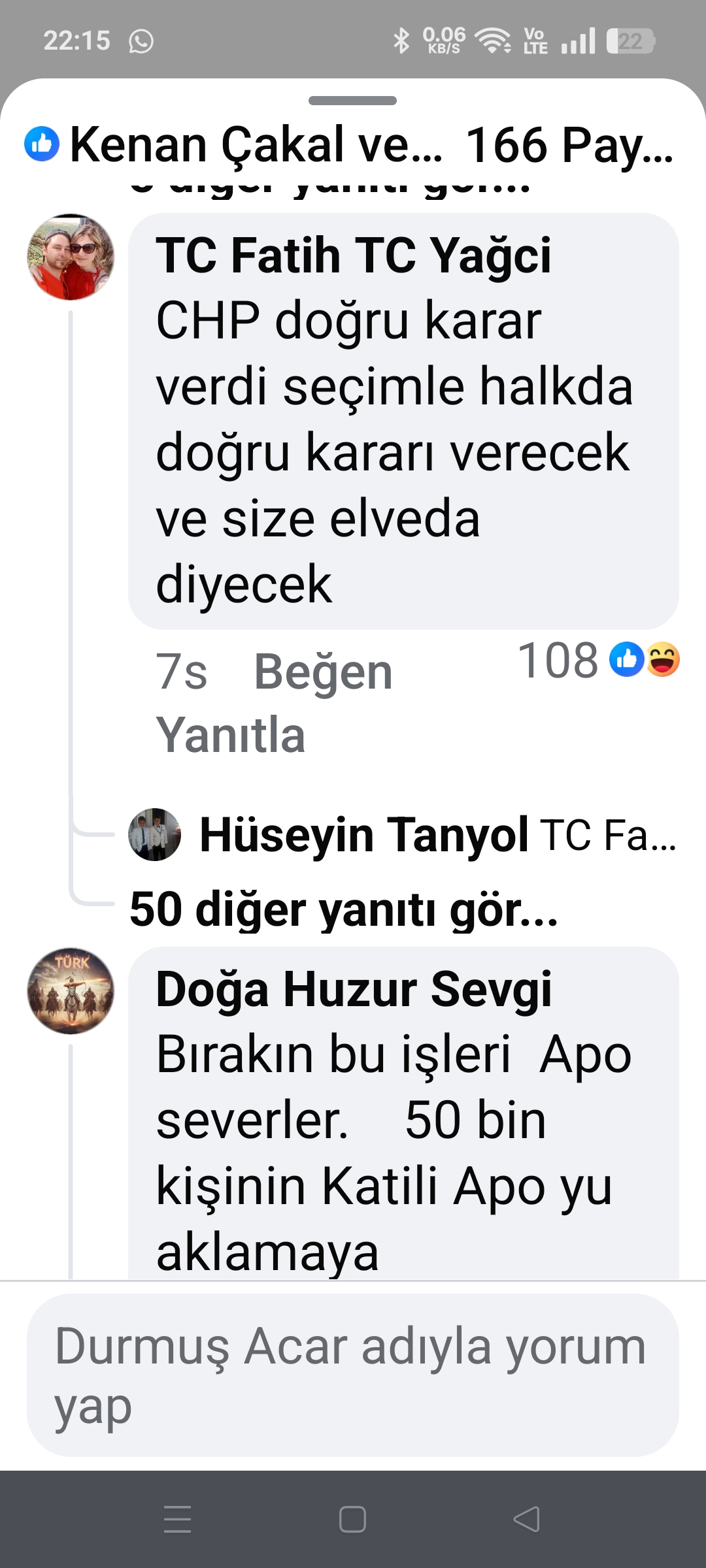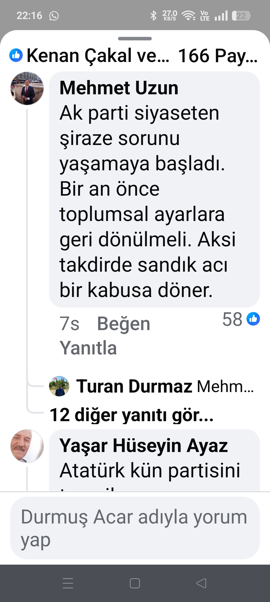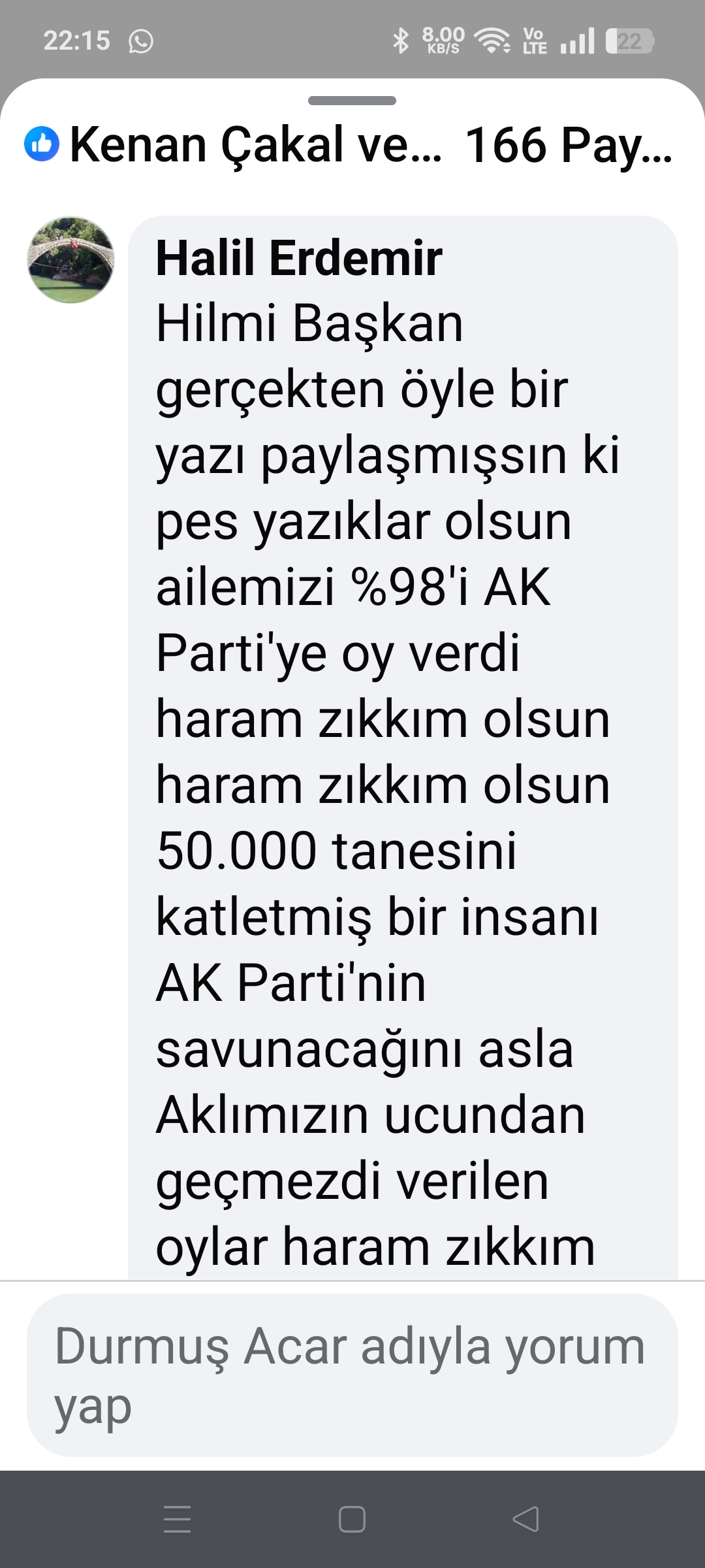 “Hilmi Başkan, gerçekten öyle bir yazı paylaşmışsınız ki pes. Yazıklar olsun. Ailemizin %98’i AK Parti’ye oy verdi, haram zıkkım olsun. 50.000 insanı katletmiş bir insanı AK Parti’nin savunacağını asla aklımızın ucundan geçirmezdik. Verilen oylar haram zıkkım.” olsun dedi.