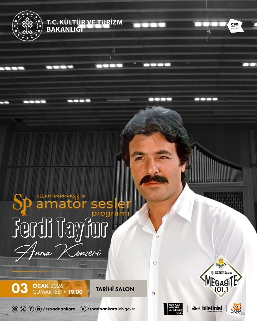 HABERMAX. Başkent Ankara’nın kültür ve sanat hayatının önemli merkezlerinden CSO Ada Ankara, 3 Ocak 2026 Cumartesi günü anlamlı bir etkinliğe ev sahipliği yapacak. Selami Parmaksız’ın sunumu ve yönetimiyle hazırlanan “Amatör Sesler Programı Ferdi Tayfur Anma Konseri”, saat 19.00’da CSO Ada Ankara Tarihi Salon’da gerçekleştirilecek.