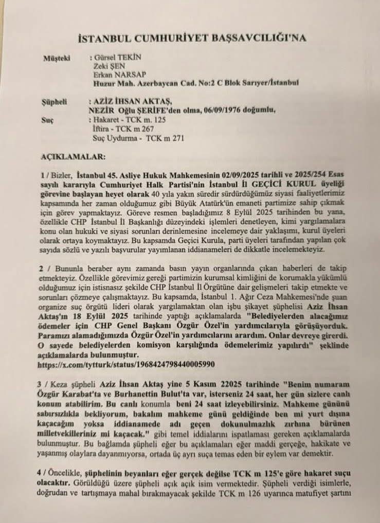 HABERMAX. Cumhuriyet Halk Partisi (CHP) İstanbul İl Geçici Kurulu üyeleri Gürsel Tekin, Zeki Şen ve Erkan Narsap, televizyon programlarında ve sosyal medyada yaptığı açıklamalar nedeniyle Aziz İhsan Aktaş hakkında hakaret (TCK 125), iftira (TCK 267) ve suç uydurma (TCK 271) suçlamalarıyla İstanbul Cumhuriyet Başsavcılığı’na suç duyurusunda bulundu.