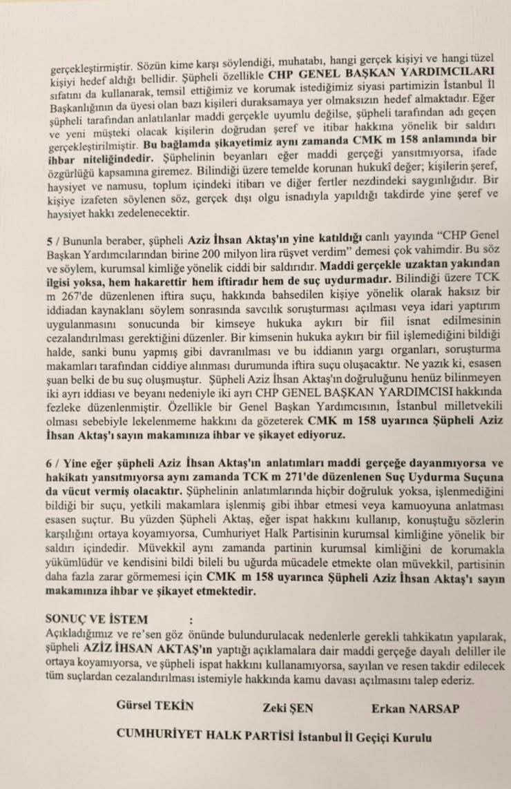 Suç duyurusunda, Aktaş’ın 5 Kasım 2025 tarihli bir başka yayında da “CHP Genel Başkan Yardımcılarından birine 200 milyon lira rüşvet verdim” sözlerini sarf ettiği hatırlatılarak, bu söylemin de “maddi gerçekle uzaktan yakından ilgisi olmayan, partinin namusuna ve güvenilirliğine ağır saldırı” niteliği taşıdığı vurgulandı.