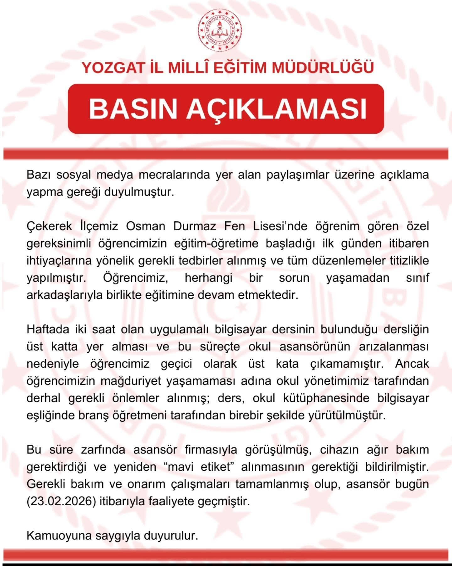Haberimizin ardından Yozgat İl Milli Eğitim Müdürlüğü tarafından basın açıklaması yapıldı. Açıklamada, asansörün ağır bakımdan geçirildiği, gerekli teknik işlemlerin tamamlandığı ve 23 Şubat 2026 tarihi itibarıyla yeniden faaliyete alındığı bildirildi.