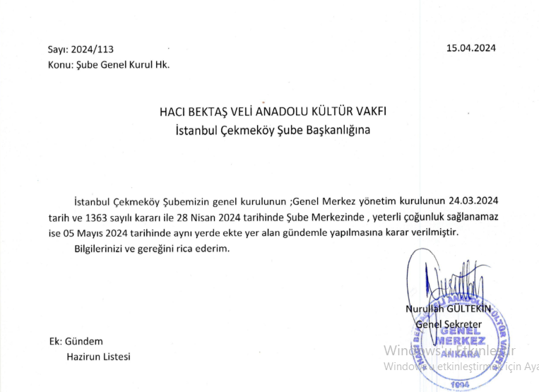 HABERMAX. Hacı Bektaş Veli Anadolu Kültür Vakfı Çekmeköy Şube’nin genel kuruluyla ilgili alınan kararı aktarıyorsunuz. 24 Mart 2024 tarihinde yapılan genel merkez yönetim kurulu toplantısında alınan karar gereği, Çekmeköy Şube genel kurulu 28 Nisan 2024 tarihinde Şube merkezinde yapılacak. Ancak yeterli çoğunluk sağlanamazsa, genel kurul 05 Mayıs 2024 tarihinde saat 13:00’da aynı yerde tekrarlanacak. Kararda belirtilen gündemle genel kurulun yapılacağı ifade ediliyor.