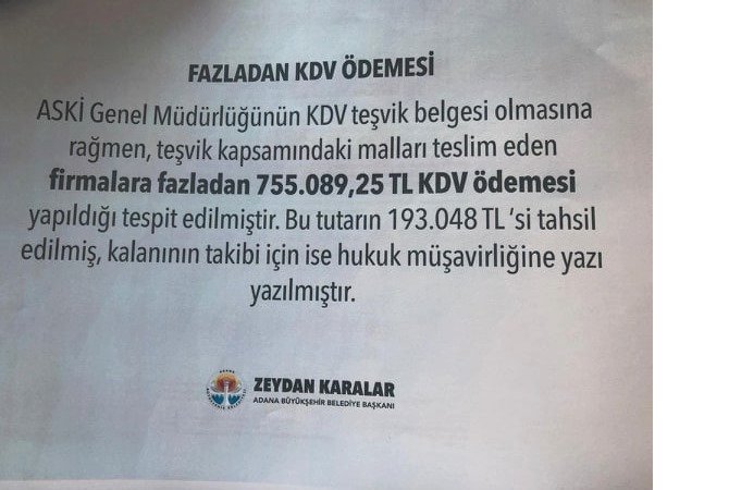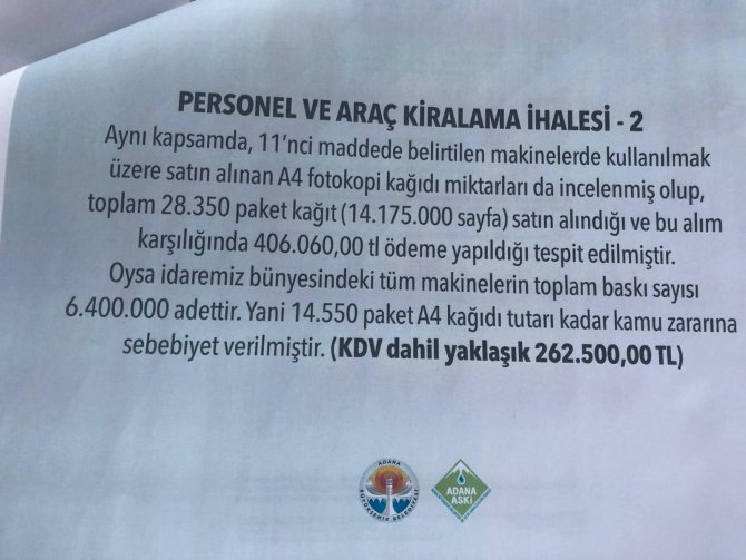 Bazı firmalara fazladan 755 bin liralık KDV ödemesi yapılması, teklifi aşırı düşük olmayan bir isteklinin teklifinin aşırı düşük olarak değerlendirilmesi nedeniyle uğranan 729 bin liralık 322 liralık kamu zararı tespiti yapıldığı ve zararların tahsili için işlem başlatıldığını kaydeden Başkan Zeydan Karalar, yazıcı, tarayıcı ve fotokopi makinelerinin toner kullanımının hesaplanmasının ardından ortaya çıkan kamu zararının tahmini olarak 2 milyon 124 bin lira olduğunu söyledi.