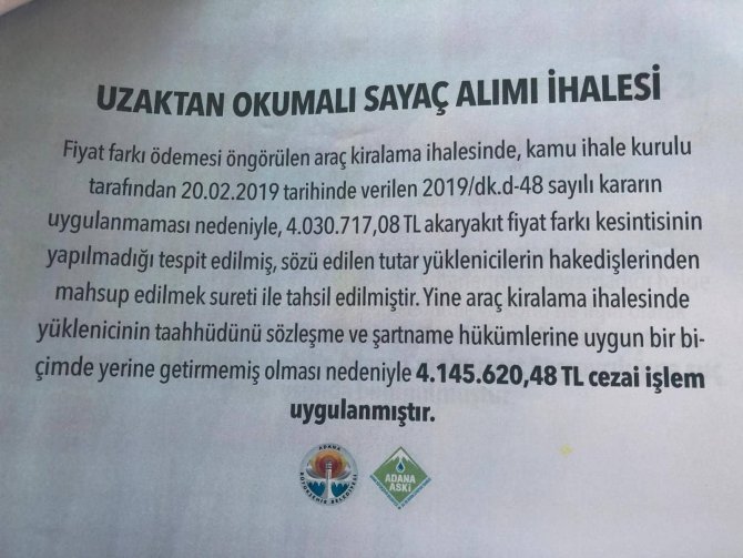 İhalede, akaryakıt fiyat farkı kesintisinin yapılmamasından dolayı ASKİ’nin kasasından çıkan 4 milyon 30 bin liranın yüklenicilerin hakkedişlerinden mahsup edilmek sureti ile tahsil edildiğini açıklayan Başkan Zeydan Karalar, araç kiralama ihalesinde yüklenicinin sözleşme hükümlerini yerine getirilmemesi nedeniyle 4 milyon 145 bin lira cezai işlem uygulandığını açıkladı.