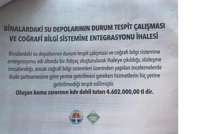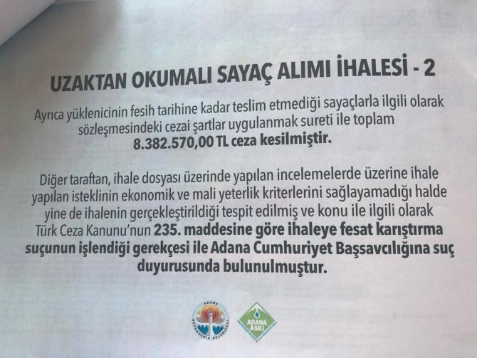 Uzaktan okumalı sayaç alımı ihalesiyle ilgili sözleşmenin feshedilmesinden kaynaklı 2 milyon 225 bin 400 liralık teminatın gelir kaydedildiğini, güncelleme farkı olan 1 milyon 171 bin 229 liranın takibi için işlem başlatıldığı, ayrıca fesih tarihine kadar teslim edilmeyen sayaçlarla ilgili 8 milyon 382 bin 570 liralık ceza kesildiğini ifade eden Başkan Zeydan Karalar, Binalardaki Su Depolarının Durum Tespit Çalışması ve Coğrafi Bilgi Sistemine Entegrasyonu adı altında bir ihtiyaç oluşturularak çıkılan ihale nedeniyle oluşan kamu zararının 4 milyon 602 bin lira olduğunu ifade etti.