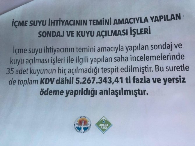 A4 fotokopi kağıdı miktarlarının da incelendiğini, konuyla ilgili kamu zararının da 262 bin lira olduğunu vurgulayan Başkan Zeydan Karalar, içme suyu ihtiyacı için açıldığı söylenen kuyulardan 35’inin hiç açılmadığını, bu suretle 5 milyon 267 bin lira fazla ve yersiz ödeme yapıldığını anlattı.
