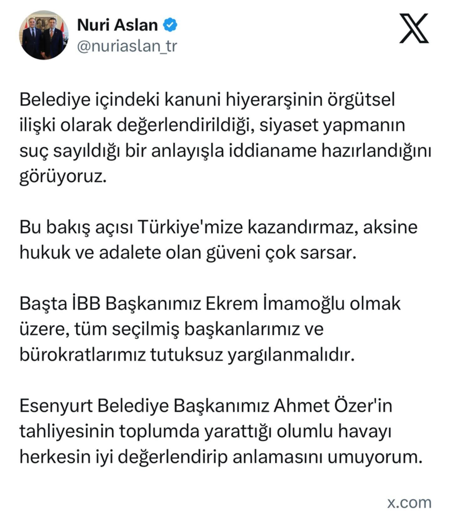Aslan’ın açıklaması, son dönemde İBB ve bazı ilçe belediyelerine yönelik yürütülen soruşturmaların ardından geldi. Özellikle Ekrem İmamoğlu hakkında devam eden davalar ve Esenyurt Belediye Başkanı Ahmet Özer’in kısa süreli tutukluluğunun ardından tahliye edilmesi, kamuoyunda geniş yankı uyandırmıştı.