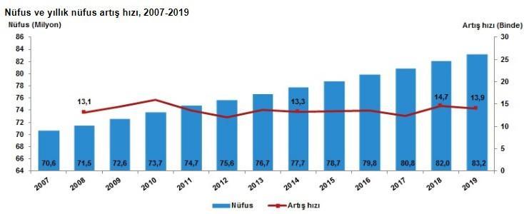 Yıllık nüfus artış hızı 2018 yılında binde 14,7 iken, 2019 yılında binde 13,9 oldu.
