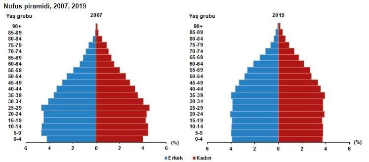 Nüfus piramitleri, nüfusun yaş ve cinsiyet yapısında meydana gelen değişimi gösteren grafikler olarak tanımlanıyor.. Türkiye’nin 2007 ve 2019 yılı nüfus piramitleri karşılaştırıldığında, doğurganlık ve ölümlülük hızlarındaki azalmaya bağlı olarak, yaşlı nüfusun arttığı ve ortanca yaşın yükseldiği görülüyor.