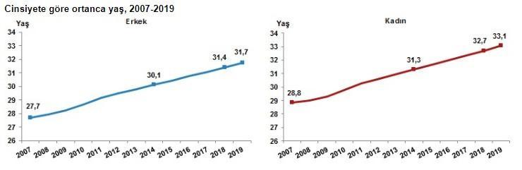 Türkiye’de 2018 yılında 32 olan ortanca yaş, 2019 yılında 32,4’e yükseldi. Cinsiyete göre incelendiğinde, ortanca yaşın erkeklerde 31,4’ten 31,7’ye, kadınlarda ise 32,7’den 33,1’e yükseldiği görüldü.