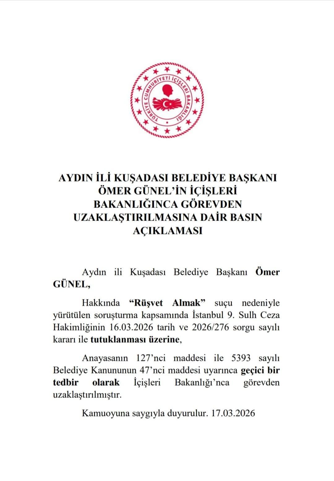 İçişleri Bakanlığı açıklamasında, söz konusu uzaklaştırma işleminin kesin bir azil olmadığı ve soruşturma süresince uygulanan “geçici bir tedbir” olduğu belirtildi. Kuşadası Belediyesi’ndeki kamu hizmetlerinin aksamaması adına, önümüzdeki günlerde belediye meclisi içinden bir başkan vekili seçilmesi veya bir görevlendirme yapılması bekleniyor.