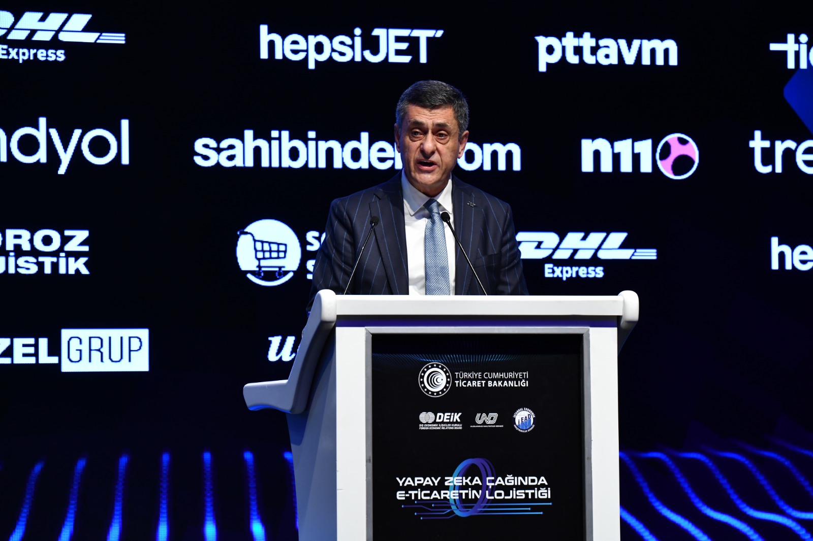 Zirvenin açılış konuşmalarını gerçekleştiren Ticaret Bakanı Ömer Bolat, “E-ticaret, giderek artan yeni ticaret yöntemi, toplam ticaretin yüzde 20’sini oluşturuyor ve 3 trilyon doların 2024 hesaplamalarıyla bir hacme sahip. Lojistik sektörü de olmazsa olmaz sektörlerimizde önde gelen büyük bir sektör. E-ticaret de o tarihlerde toplam ticaretin içinde yüzde 4,5-5’lik bir paya sahipken, 2019 itibarıyla, toplam ticarette yüzde 20’lik bir paya 3-4 sene gibi kısa bir sürede ulaşmış oldu. Bugün Türkiye için gerek mal ticareti gerekse hizmetler ticareti ekonomimizde büyük bir yer tutuyor. Mal ihracatımız geçen yıl 255,5 milyar dolardı, buna karşılık aynı şekilde mal ithalatımız 365 milyar dolardı. Hizmet ihracatımız 122,5 milyar dolardı. Hizmet ithalatımız da yaklaşık 60 milyar dolar ve bunların toplamı 820 milyar dolarlık bir mal ve hizmet ticareti ile iştigal ettik. Ve geçen yıl milli gelirimiz 1,1 trilyon dolara yükseldi. Milli gelirimizin yarısından fazlası mal ve hizmet ihracat ve ithalat ticareti kadar bir hacim oluşturuyordu” dedi.