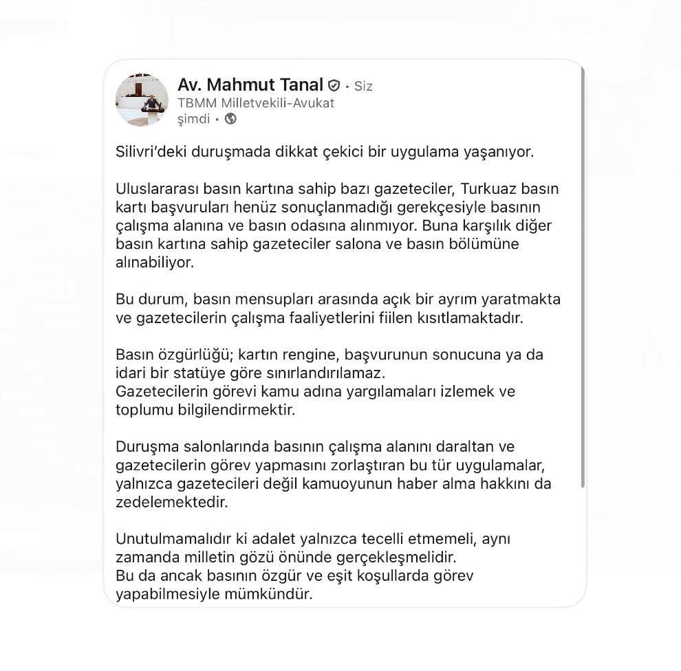 HABERMAX. Cumhuriyet Halk Partisi (CHP) Şanlıurfa Milletvekili Av. , Silivri’de görülen bir duruşmada basın mensuplarına yönelik uygulamaya tepki gösterdi. Tanal, duruşma sırasında uluslararası basın kartına sahip bazı gazetecilerin, Turkuaz basın kartı başvuruları henüz sonuçlanmadığı gerekçesiyle basının çalışma alanına ve basın odasına alınmadığını belirtti. Buna karşılık farklı basın kartına sahip gazetecilerin ise salona ve basın bölümüne giriş yapabildiğini ifade etti.