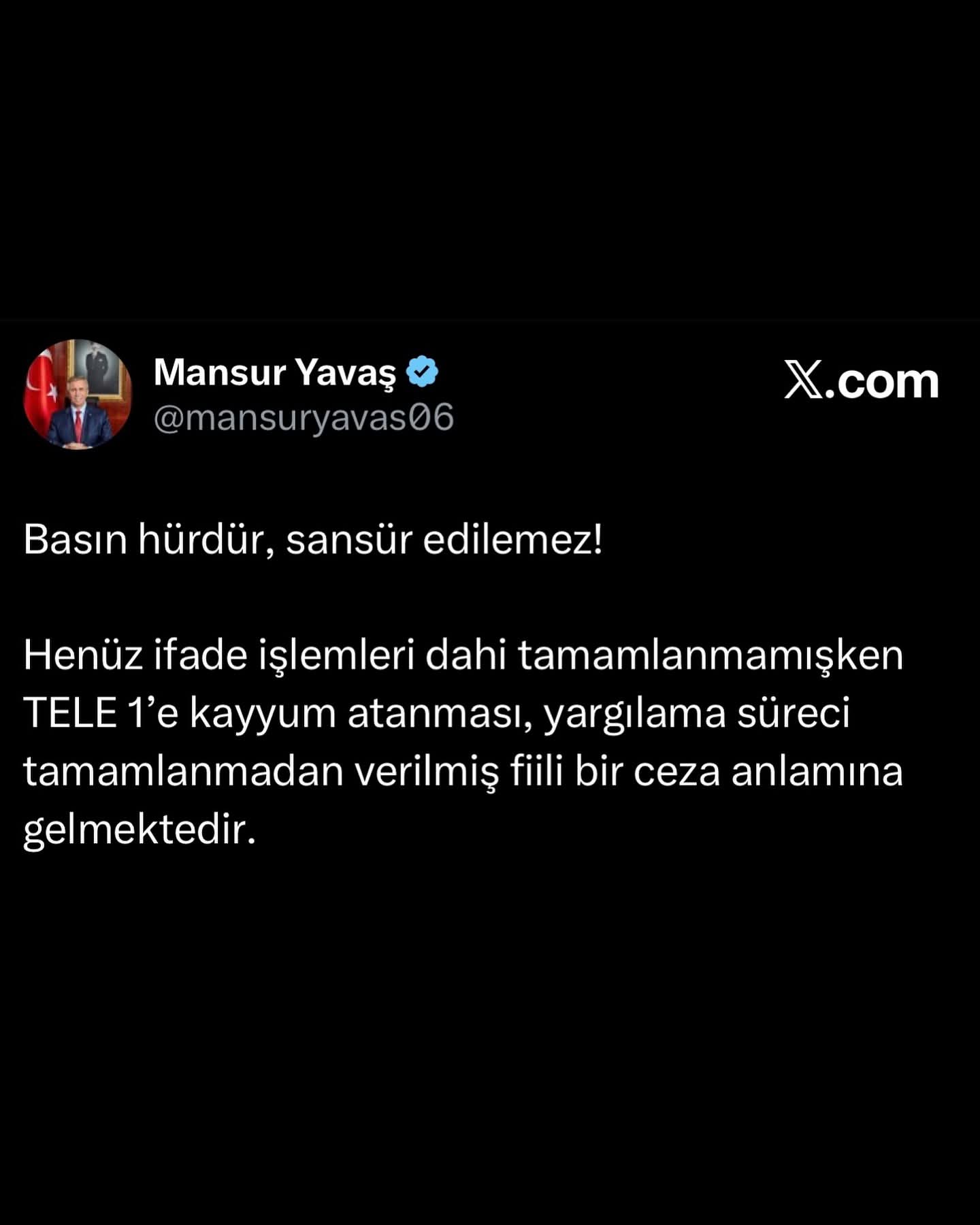 Yavaş açıklamasında, “Henüz ifade işlemleri dahi tamamlanmamışken TELE 1’e kayyum atanması, yargılama süreci tamamlanmadan verilmiş fiili bir ceza anlamına gelmektedir. Basın hürdür, sansür edilemez!” ifadelerini kullandı.