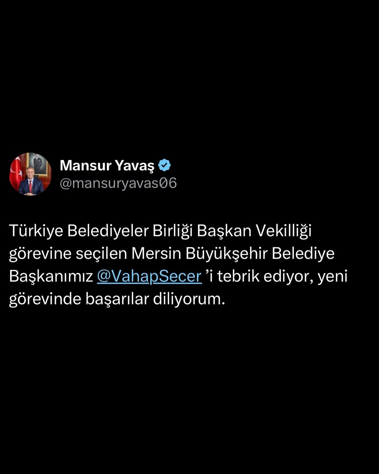 “Türkiye Belediyeler Birliği Başkan Vekilliği görevine seçilen Mersin Büyükşehir Belediye Başkanımız Sayın Vahap Seçer’i tebrik ediyor, yeni görevinde başarılar diliyorum.”