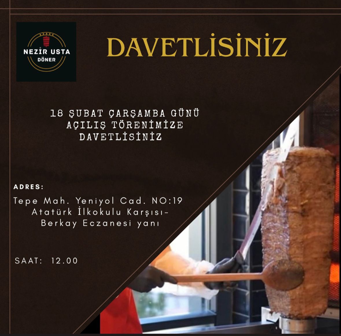 Canan Çalışkan işletmeciliğinde hayata geçirilen Nezir Usta Döner, kalite, hijyen ve lezzeti bir arada sunarak bölgedeki döner tutkunlarının vazgeçilmez adreslerinden biri olmayı hedefliyor. Açılış gününde sürpriz ikramların da olacağı öğrenildi.