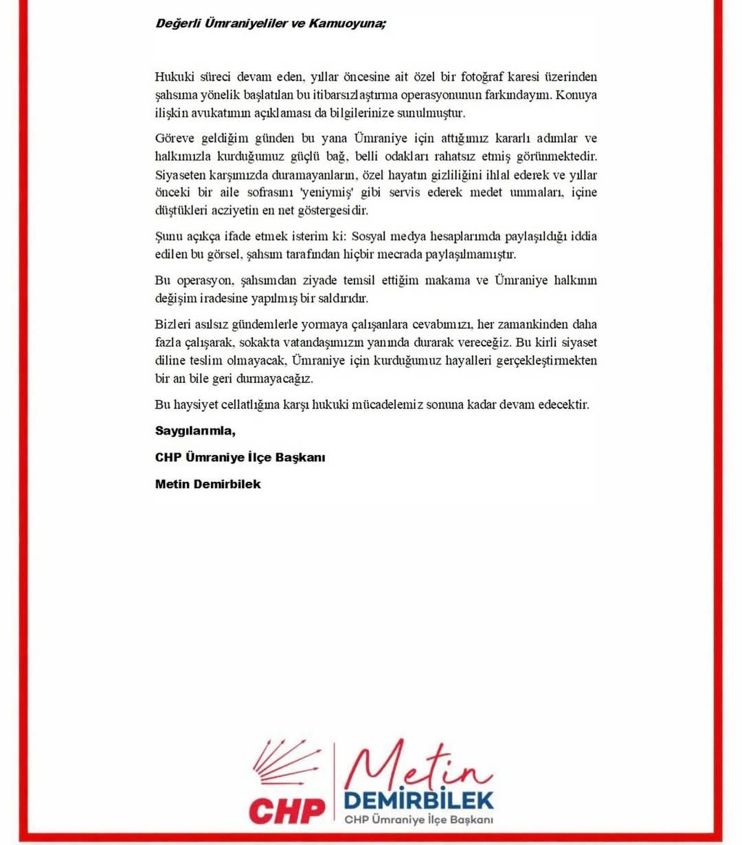 Yaşanan süreç, özel hayatın gizliliğinin korunması ve siyasi rekabetin etik sınırlar içinde yürütülmesinin önemini bir kez daha gözler önüne serdi. CHP Ümraniye İlçe Başkanı Metin Demirbilek’in açıklamaları ve hukuki adımları, bu tür itibarsızlaştırma girişimlerine karşı nasıl bir tavır alınabileceğini gösteriyor.