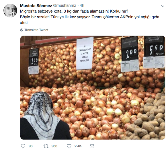 Sönmez, özellikle Migros gibi süpermarket zincirlerinde sebze ve meyve alışverişine uygulanan 3 kilogram kota uygulamasını eleştirerek, “Korku ne? Böyle bir rezaleti Türkiye ilk kez yaşıyor. Tarımı çökerten AKP’nin yol açtığı gıda afeti” şeklinde yorum yaptı. Sönmez’in bu tweet’i, sosyal medyada büyük yankı uyandırarak bine yakın retweet aldı.