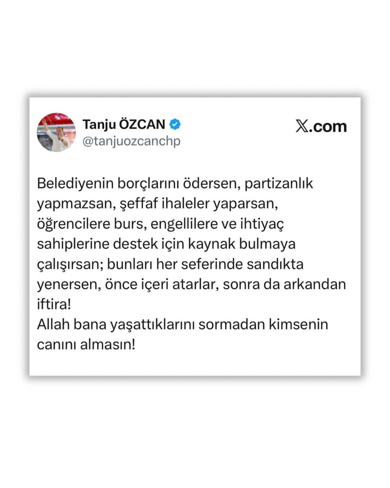 > “Belediyenin borçlarını ödersen, partizanlık yapmazsan, şeffaf ihaleler yaparsan, öğrencilere burs, engellilere ve ihtiyaç sahiplerine destek için kaynak bulmaya çalışırsan; bunları her seferinde sandıkta yenersen, önce içeri atarlar, sonra da arkandan iftira!”