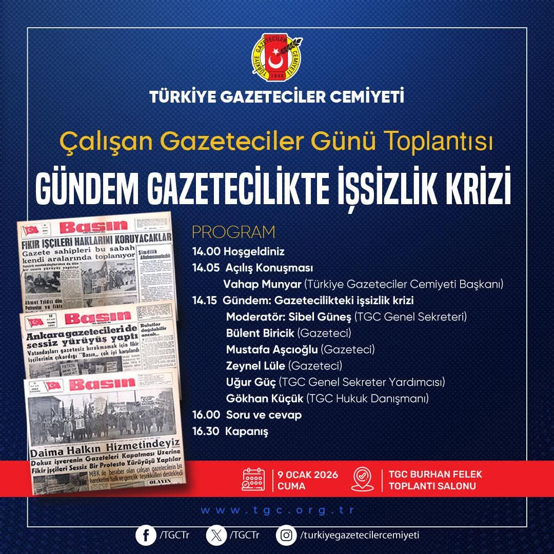 TGC tarafından yapılan açıklamada, gazetecilikte işsizlik oranının yaklaşık yüzde 30 seviyelerine ulaştığına dikkat çekilerek, bu tablonun mesleğin geleceği açısından ciddi riskler barındırdığı vurgulandı. Toplantıda; sansür, kayyum uygulamaları ile siyasi ve ekonomik baskıların gazetecilik alanında yarattığı tahribat ele alınacak.