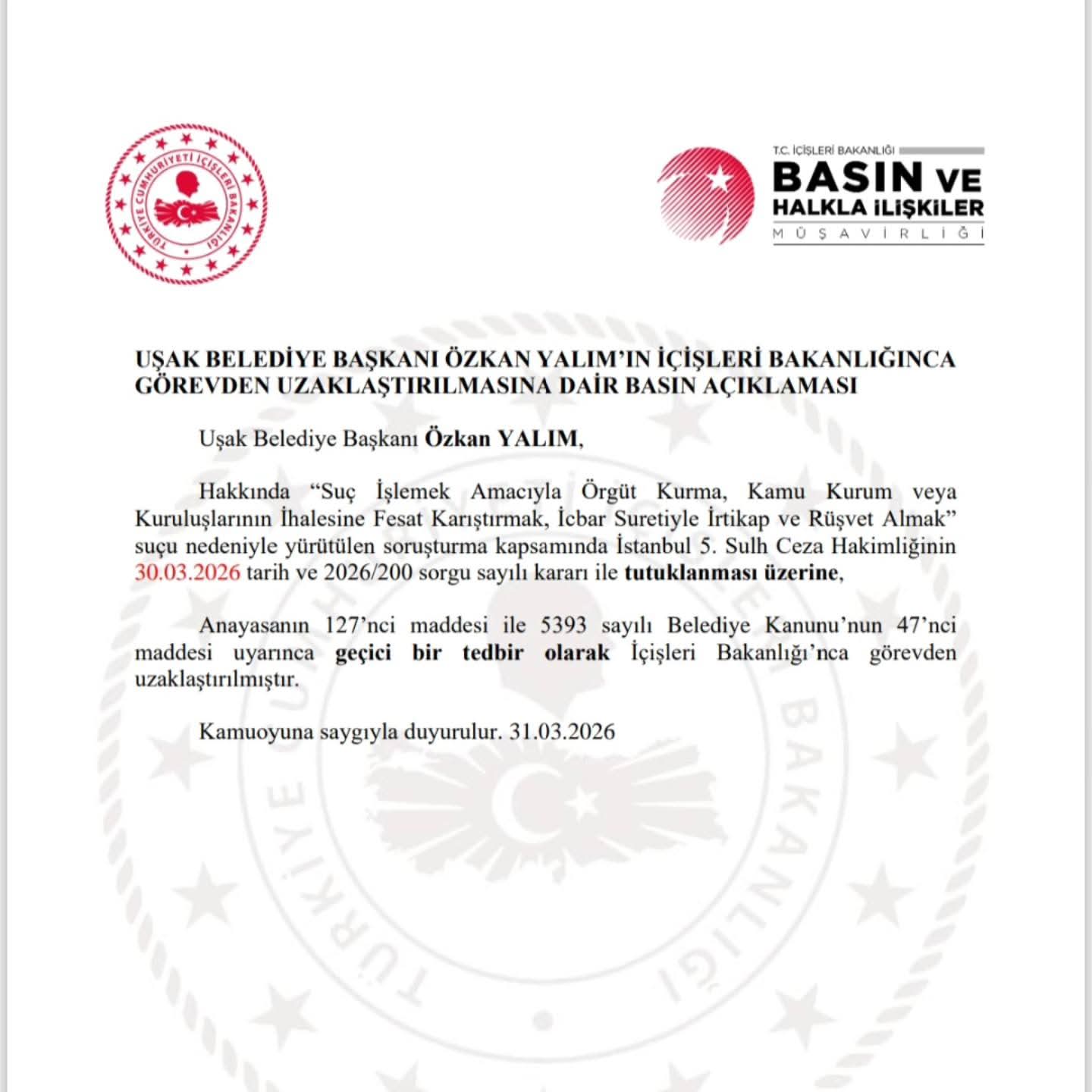 HABERMAX. UŞAK – Özkan Yalım hakkında yürütülen soruşturma kapsamında tutuklanmasının ardından, İçişleri Bakanlığı tarafından görevden uzaklaştırıldığı açıklandı. Kararın, anayasal yetkiler çerçevesinde “geçici tedbir” olarak alındığı bildirildi.