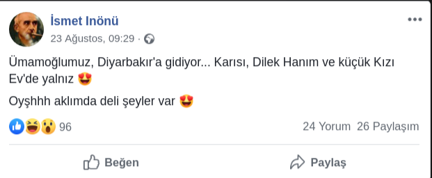 AHA.İsmet İnönü’ye hakaret ve iftiralar içeren Facabook sayfasından İBB Başkanı Ekrem İmamoğlu, eşi ve kızı üzerinden tehdit edildi.